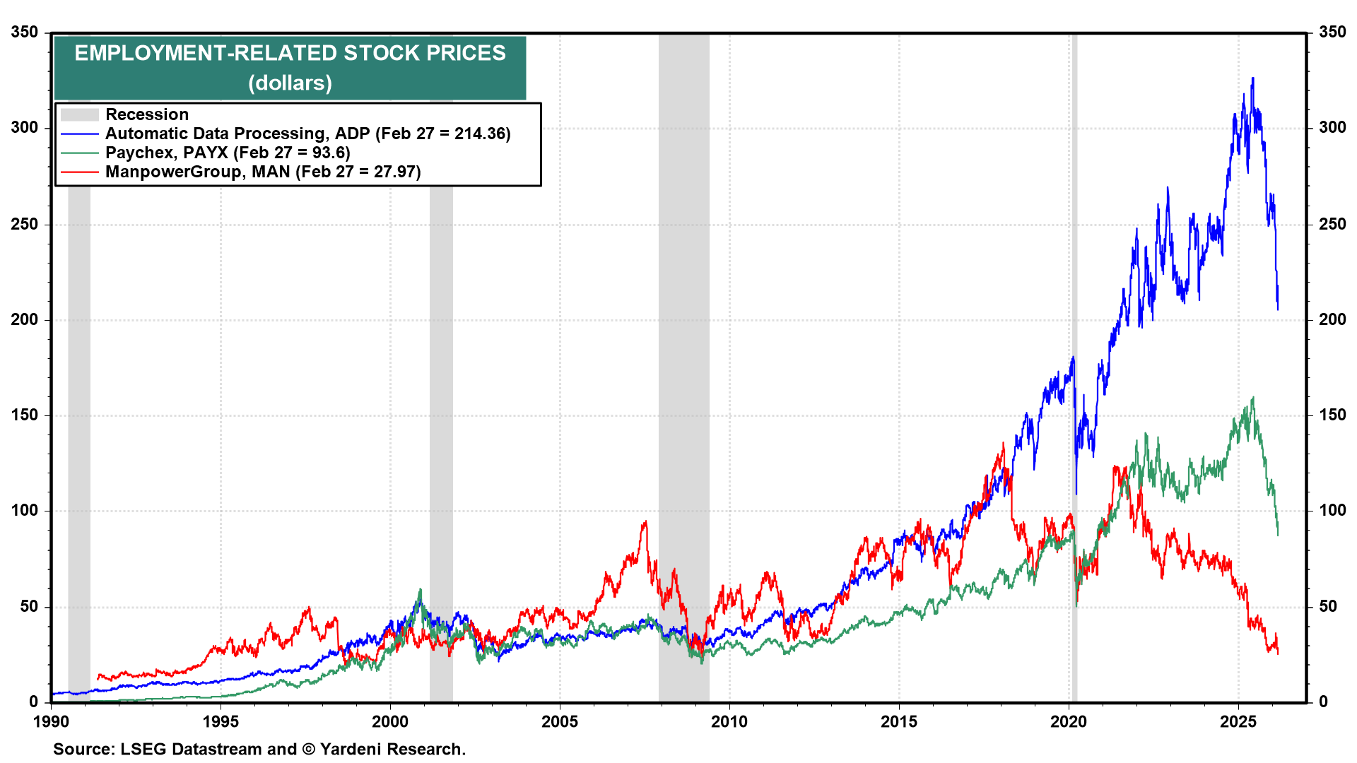 (6) Employment. In addition to private credit concerns, investors are worried that AI will destroy jobs. Friday’s stock market weakness was partly attributable to Block announcing a 4,000-worker cut (more than 40% of its workforce) due to AI. The stock prices of employment-related companies continued to plunge on the news (chart).