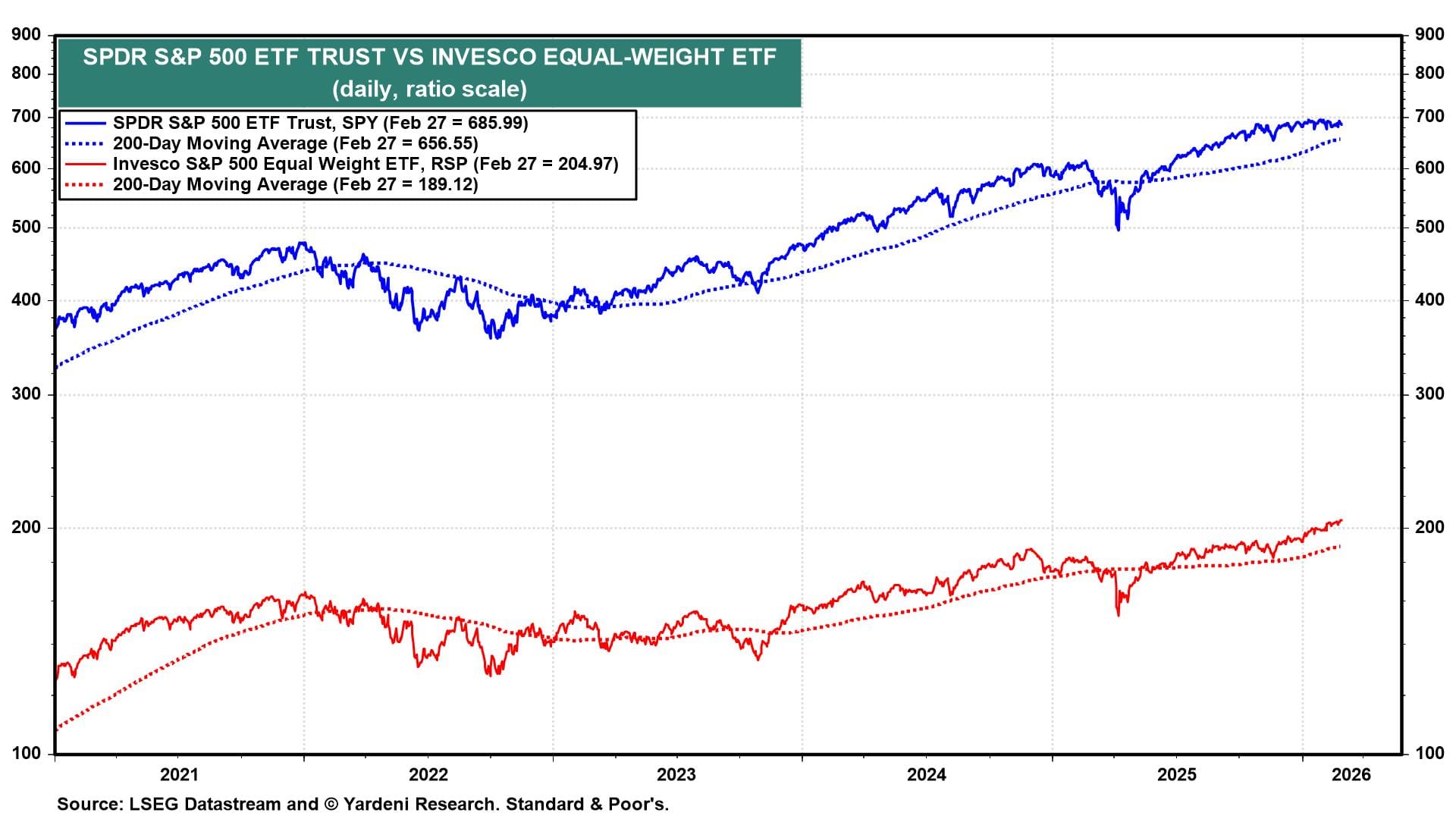 (1) Performance. RSP (the S&P 500 equal-weight ETF) rose to a new record high on Friday, while SPY (the S&P 500 market-weight ETF) fell 0.4% (chart). The former is up 7.0% ytd, while the latter is up just 0.6%. In early December of last year, we recommended rebalancing out of the Magnificent-7 and into the Impressive-493. So far, so good, as the former has outperformed the latter. We expected that the stock market might be choppy during the first half of the year. That’s half true, as RSP has risen to record highs, while SPY has churned below 700, just as the S&P 500 market-weight stock price index has been choppy below 7000.
