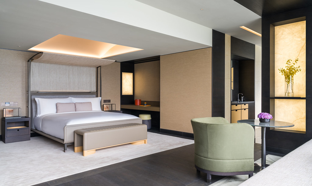 Guestrooms and suites are designed as “Personal Havens,” combining harbour views with understated interiors. Windowfront seating areas and daybeds frame the skyline, while bathrooms feature deep soaking bathtubs positioned to maximise natural views. Neutral tones and layered textures define the overall design approach.