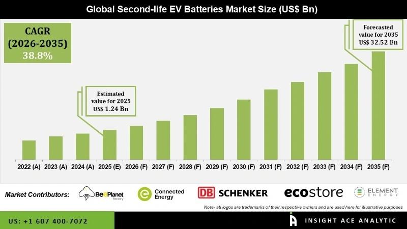 InsightAce Analytic Pvt. Ltd. announces the release of a market assessment report on the “Global Second-life EV Batteries Market Size, Share & Trends Analysis Report By Product (Nickel-based, Lithium-Ion, Lead-Acid, and Others), Application (Automotive Applications [EV Charging, Vehicle] and Non-Automotive Applications [Power Backup, Renewable Energy Storage, Grid Connection, Others]),-Market Outlook And Industry Analysis 2035”