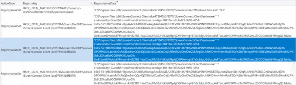 These entries contained extensive encoded payloads detailing server addresses, session identifiers, and authentication parameters. Such configuration depth ensures that the ScreenConnect backdoor maintained: