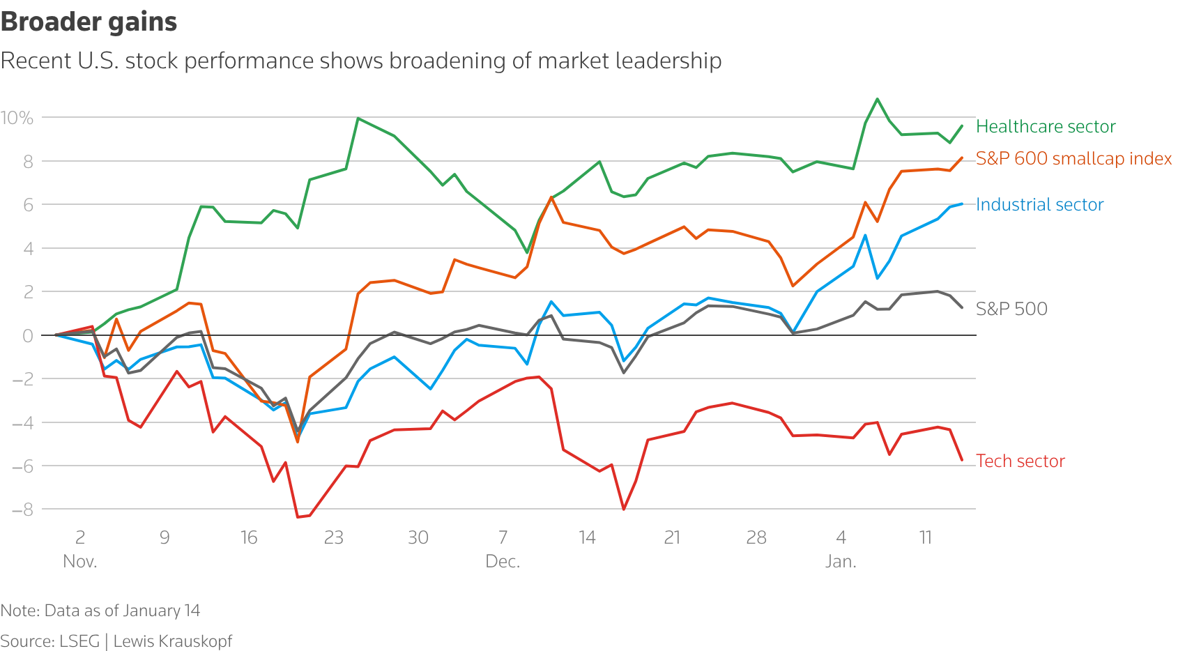 In another sign of broadening, the equal-weight version of the S&P 500 (.SPXEW), opens new tab, which is a gauge for the average stock in the index, has gained over 5% since the end of October. That tops a 1% rise for the standard S&P 500, which is more heavily influenced by heavyweight stocks.
