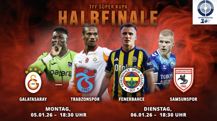 All matches will be shown on the linear Sportdigital1+ channel. The four-team competition brings together Galatasaray, Fenerbahçe, Samsunspor, and Trabzonspor, with two semi-finals followed by the final on January 10.