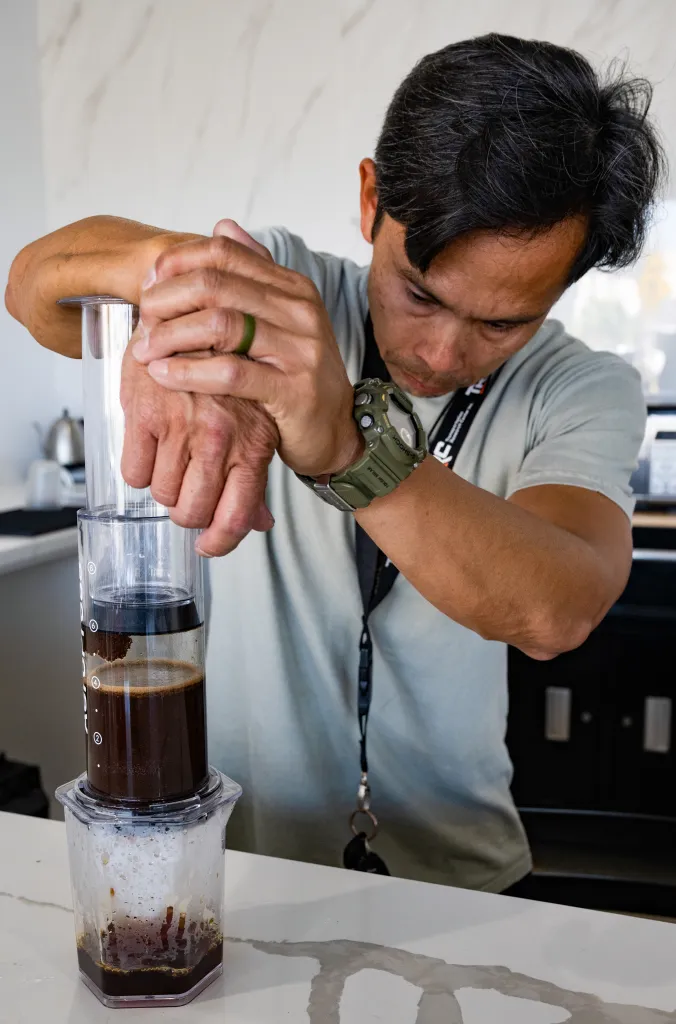 Teofilo Coffee owner Ron Dizon presses down the Aeropress on April 6, 2026, as he makes the single origin coffee in the new location at second street. The use of the Aeropress is to give a unique clean and tastier coffee in comparison to other forms of methods of brewing opening to greater taste. (Jorge Hernandez | Signal Tribune)