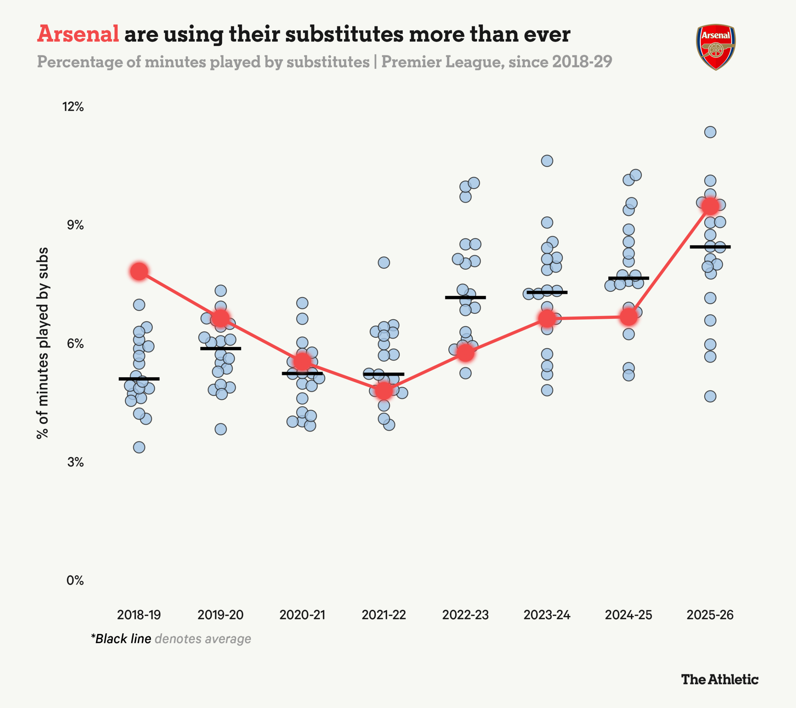 Mikel Arteta’s squad is the strongest it has been. This summer, they strengthened across the pitch, including the additions of Eberechi Eze, Viktor Gyokeres, Cristhian Mosquera and Martin Zubimendi. With that unprecedented depth, Arteta is leaning hard on his bench. No Premier League side makes their first substitution earlier, and Arsenal’s substitutes now play almost 10 per cent of available minutes, the highest share during Arteta’s reign.
