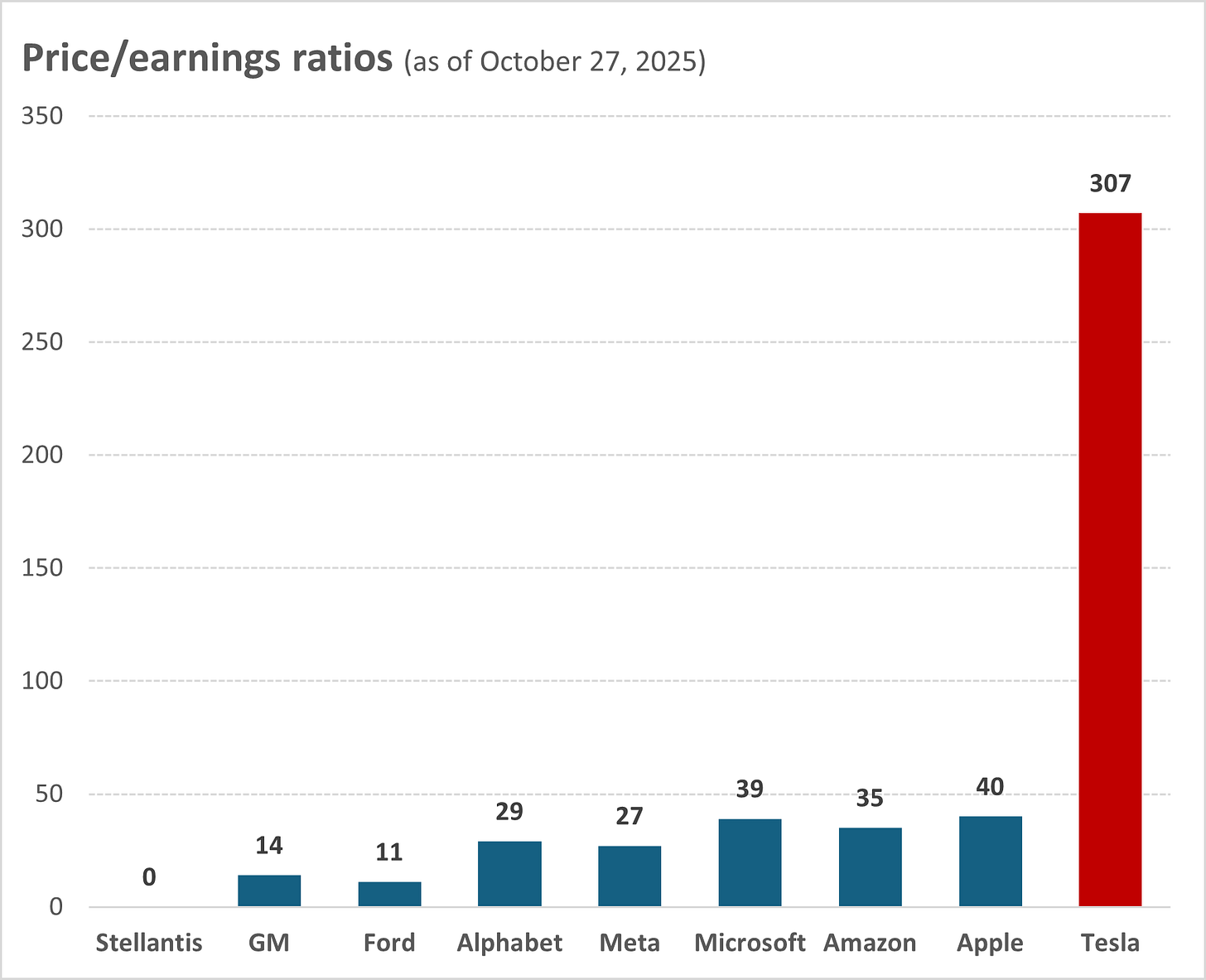 Back in March I wrote a post about the DOGE-driven backlash against Tesla and argued that it is basically a meme stock. To illustrate, I made a chart comparing Tesla’s price/earnings ratio to that of its peers in both the auto and tech industries. The P/E ratio compares a company’s stock price to the amount of money it’s actually making; while it isn’t a perfect measure of whether a stock is overvalued, it can be quite suggestive. If a company has a huge P/E ratio, it can mean that while it isn’t making much money now, investors foresee that it will eventually become hugely profitable. Or it can mean that the stock is just overhyped. But Tesla does make money; it’s not like it’s a brand-new company with an untested product that might just go big if everything works out. For its P/E ratio to be justified, it would have to mean that in the future its profits will rise exponentially.
