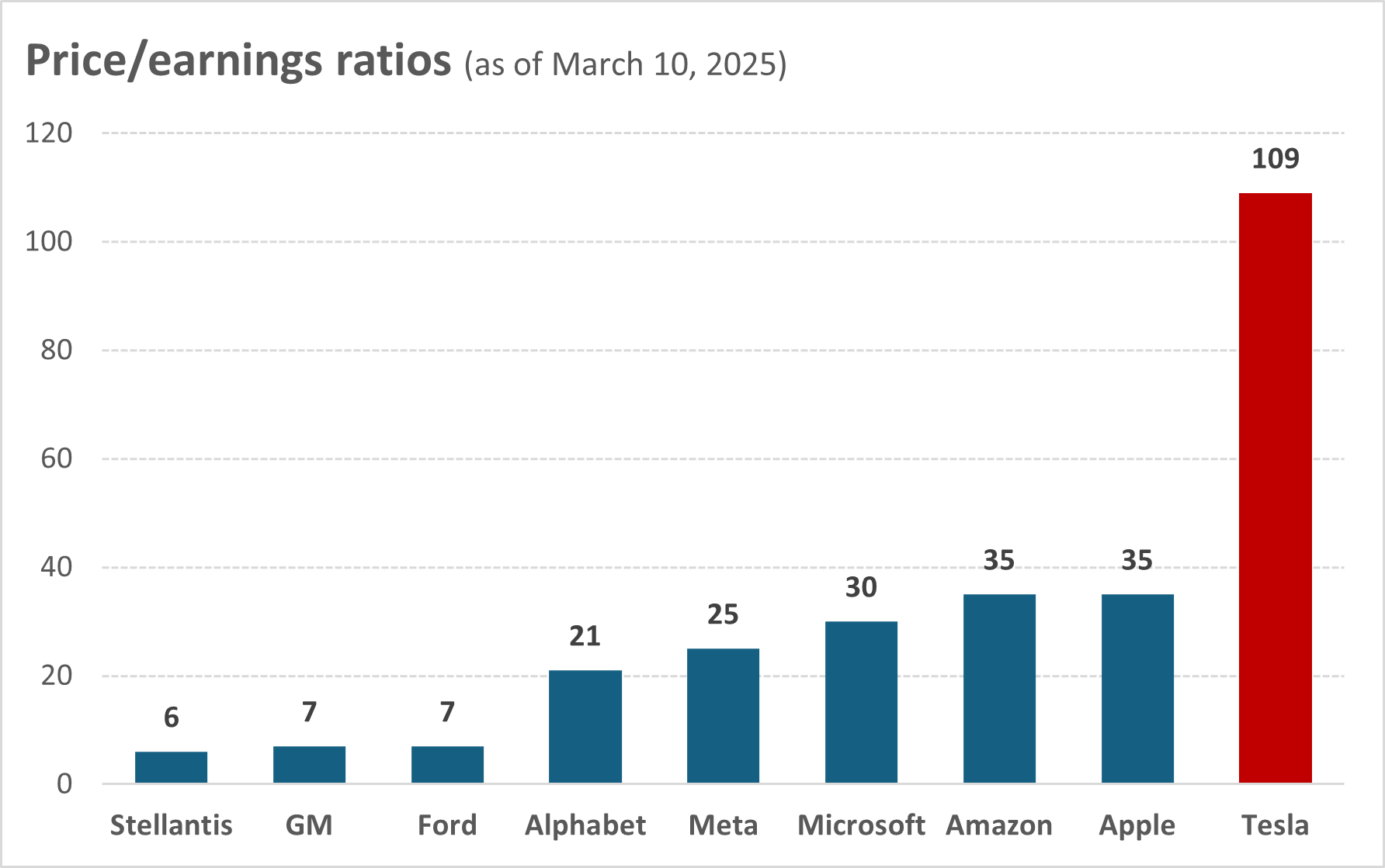 Back in March I wrote a post about the DOGE-driven backlash against Tesla and argued that it is basically a meme stock. To illustrate, I made a chart comparing Tesla’s price/earnings ratio to that of its peers in both the auto and tech industries. The P/E ratio compares a company’s stock price to the amount of money it’s actually making; while it isn’t a perfect measure of whether a stock is overvalued, it can be quite suggestive. If a company has a huge P/E ratio, it can mean that while it isn’t making much money now, investors foresee that it will eventually become hugely profitable. Or it can mean that the stock is just overhyped. But Tesla does make money; it’s not like it’s a brand-new company with an untested product that might just go big if everything works out. For its P/E ratio to be justified, it would have to mean that in the future its profits will rise exponentially.
