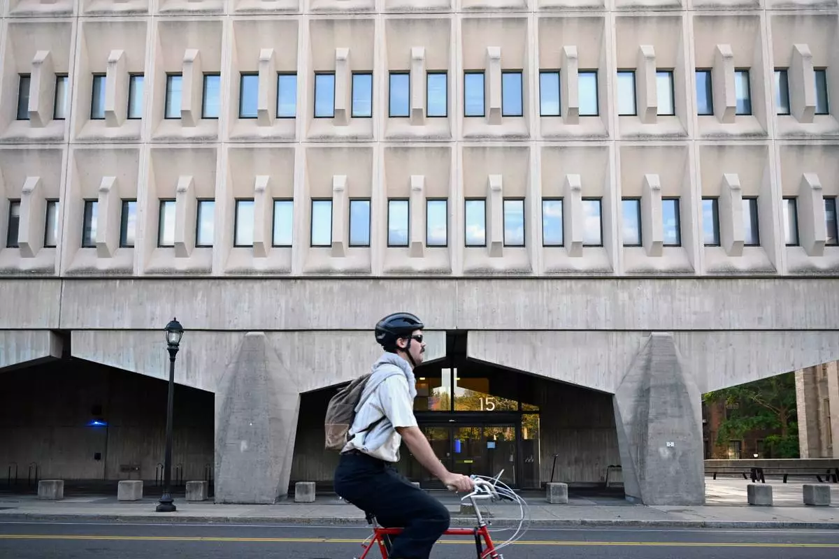 A bicyclist rides past the Becton Engineering and Applied Science Center at Yale University where Yale Professor Emeritus of Applied Physics Michel Devoret has an office and laboratory, Tuesday, Oct. 7, 2025, in New Haven, Conn. (AP Photo/Jessica Hill)