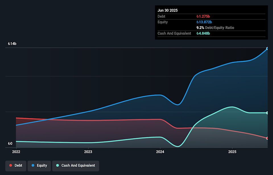 Operations: Lila Kagit generates revenue primarily from its Paper & Paper Products segment, amounting to TRY13.60 billion. The company’s financial performance is reflected in a net profit margin trend worth noting for further analysis.