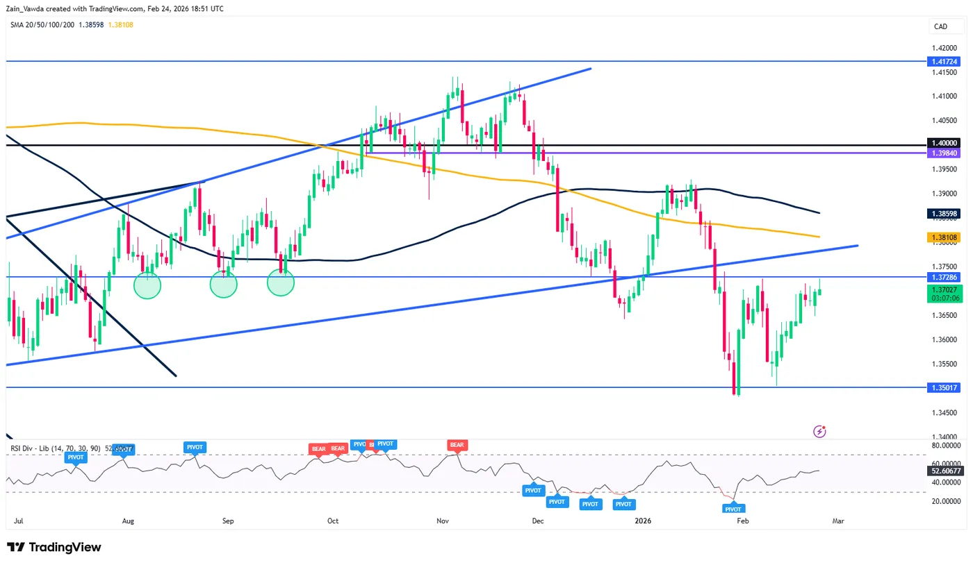 - USD/CAD is testing a critical confluence level at 1.3728, a key resistance area.