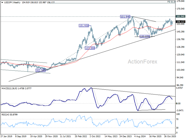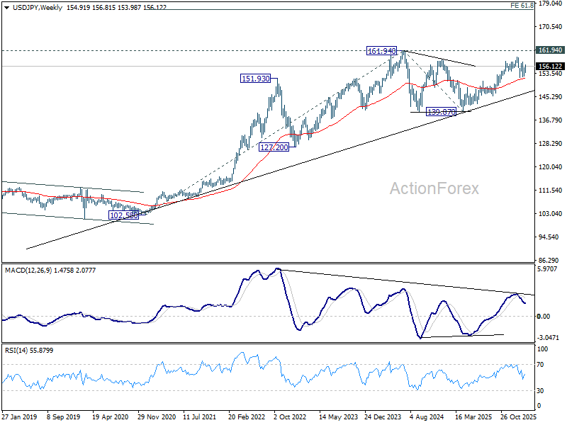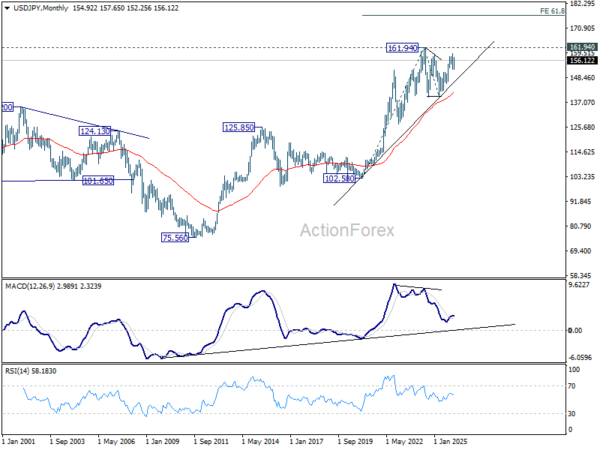 In the bigger picture, outlook is unchanged that corrective pattern from 161.94 (2024 high) should have completed with three waves at 139.87. Larger up trend from 102.58 (2021 low) could be ready to resume through 161.94. This will remain the favored case as long as 55 W EMA (now at 151.98) holds. However, sustained break of 55 W EMA will argue that the pattern from 161.94 is extending with another falling leg.