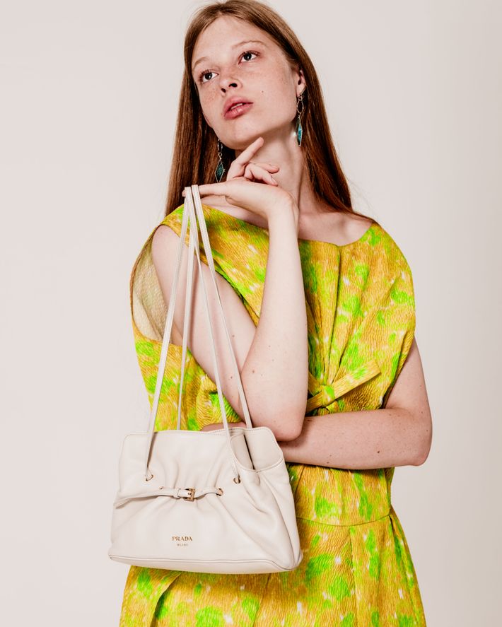PRADA Dress, Earrings, and Bag, at prada.com.