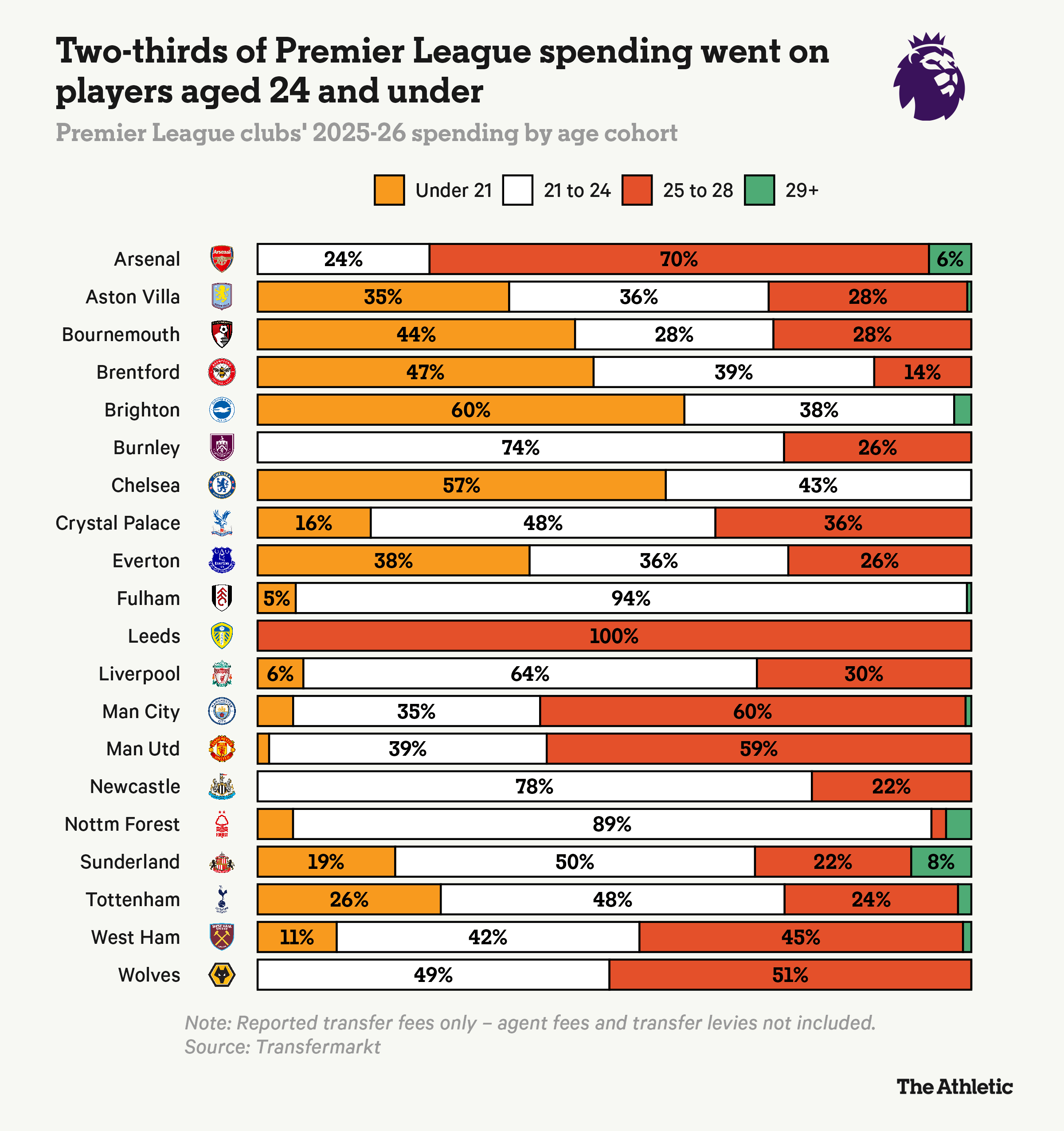 Interestingly, the only club to direct a higher proportion of their 2025-26 spend at under-21 players were Brighton, who Chelsea have regularly signed players from in recent seasons.
