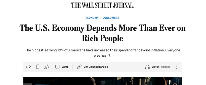 The top ten percent of earners “now account for 49.7% of all spending, a record in data going back to 1989, according to an analysis by Moody’s Analytics. Three decades ago, they accounted for about 36%.”