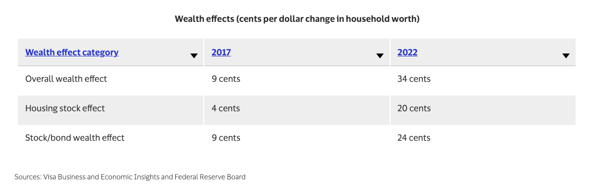 If, however, asset appreciation becomes something that people get used to as a form of compensation, then the wealth effect should grow. And that’s what we’ve seen. During the Covid stock market spike in 2022, the wealth effect increased dramatically. Visa put out some numbers on the phenomenon.