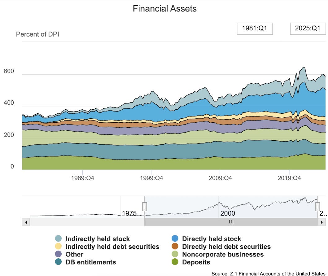 Why? Where are the new assets coming from? The answer is the stock market and real estate. The top three categories are how much stocks and bonds households own. The bottom three are cash, pensions, and small business “non-corporate ownership” stakes. You can see, immediately, that stock ownership has exploded over time, and the higher share of financial assets as a percentage of disposable income are a result of higher equity values. Today, 68% of households own stock.